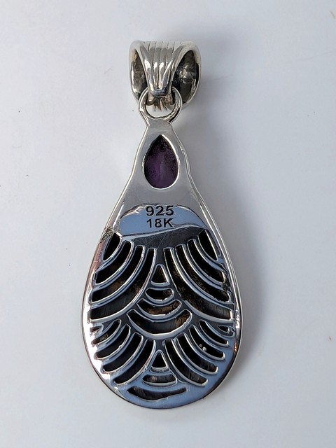 Amethyst Pendant in Ornate Sterling Silver Setting | 18K Gold Plated Detail | Faceted Pear Cut, Purple.