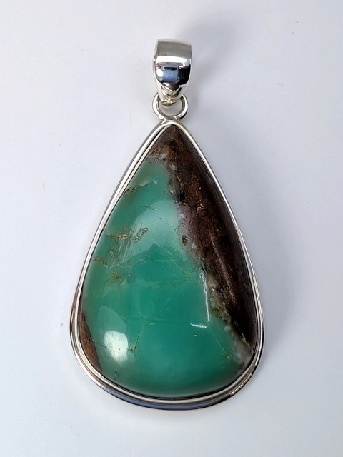 Chrysoprase Pendant in Sterling Silver | Bezel Set | Pear Cut Cabochon, Green, Brown.