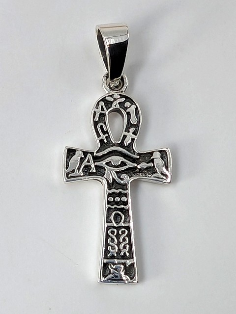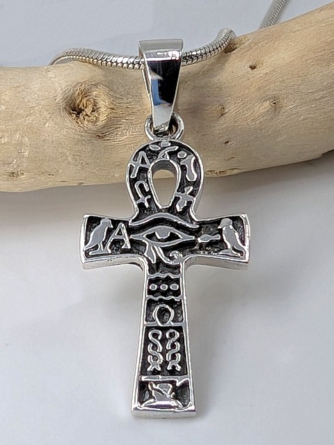 Egyptian Ankh with Eye of Horus & Hieroglyphics Pendant in Sterling Silver