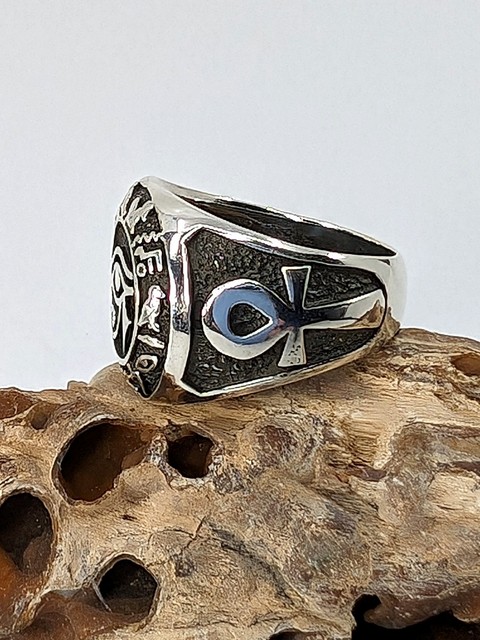 Egyptian Eye of Ra & Ankh Ring in Sterling Silver with Hieroglyphics