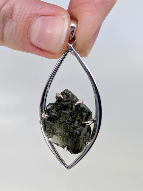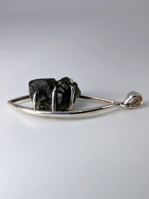 Moldavite Pendant in Sterling Silver | Blue Turtles Design | Claw Set | Raw | Deep Olive Green.