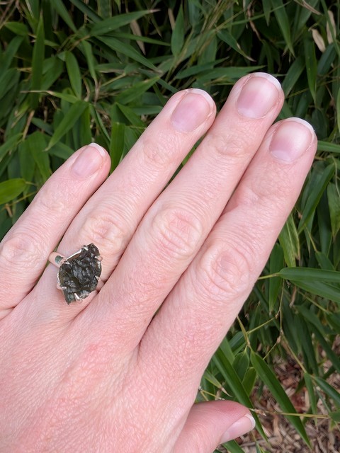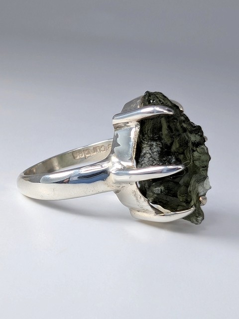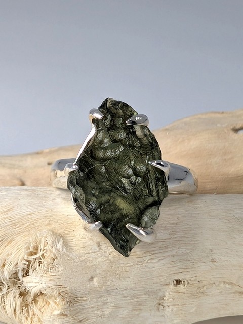 Moldavite Ring in Sterling Silver | Blue Turtles Design | Claw Set | Raw | Deep Olive Green | Size N.