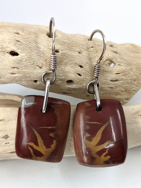 Noreena Jasper in Sterling Silver Drop Earrings | Rectangular Cut Cabochons, Deep Red, Grey, Yellow.