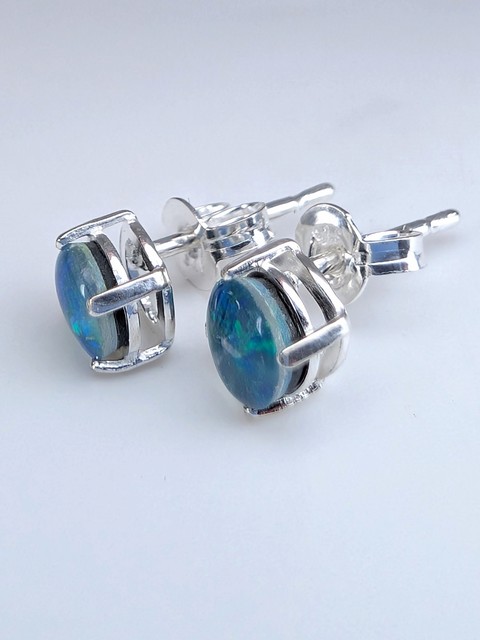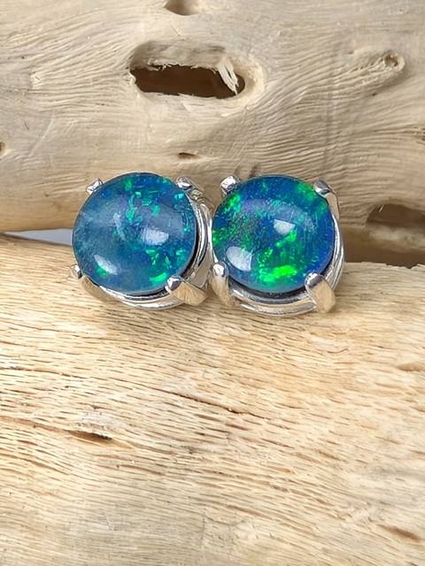 Opal in Sterling Silver Stud Earrings | Claw Set | Round Cabochon Triplets, Blues & Greens | Coober Pedy, Australia.