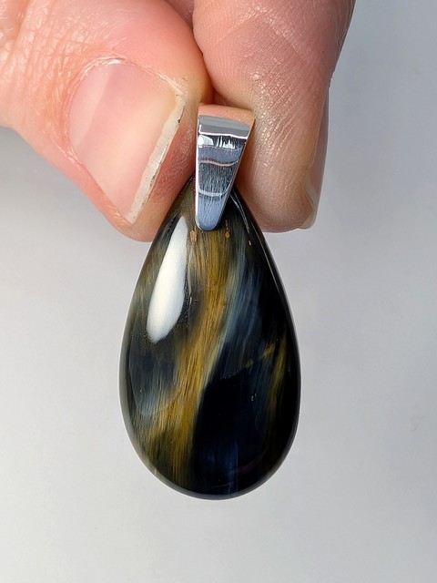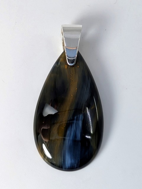 Pietersite Pendant, Namibia with Sterling Silver Bail | Pear Shape Cabochon, Earthy Tan Brown, Deep Blue with Chatoyancy or Sheen of Lighter Blue /Silvery-White