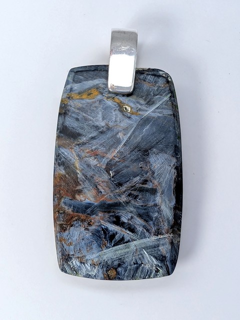 Pietersite Pendant, Namibia with Sterling Silver Bail | Rectangular Cabochon, Earthy Tan Brown, Deep Blue with Chatoyancy or Sheen of Lighter Blue /Silvery-White