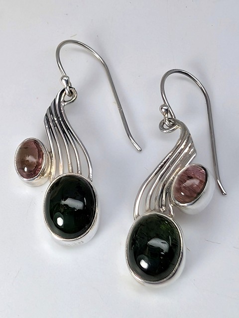 Pink & Green Tourmaline Earrings, Drops in Sterling Silver | Oval Cut Cabochons.