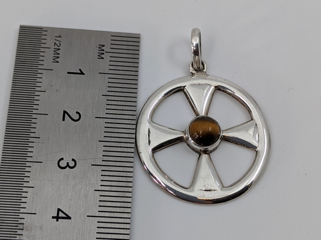 Tiger Eye Pendant in Sterling Silver | Bezel Set | Round Cabochon Cut, Golden Brown.